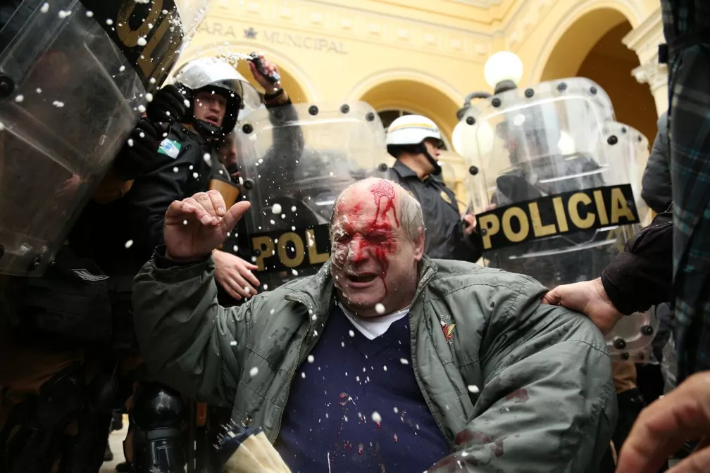 Servidor público é agredido em 2017 durante a greve que tentou evitar o pacotaço. Foto: Rodrigo Fonseca/CMC